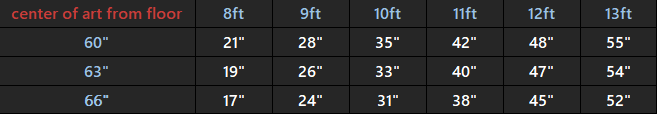 As a general rule, the light fixtures lighting your artwork should be at a 30 degree beam angle. As an example, if you have 9ft ceilings and the center of your artwork is 63” from the floor, your lighting should be placed 26in from the wall.